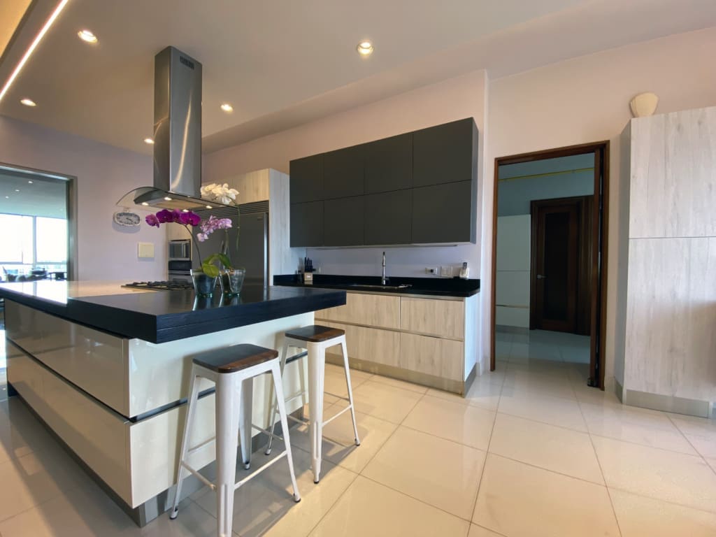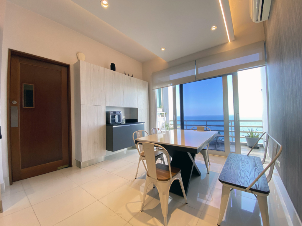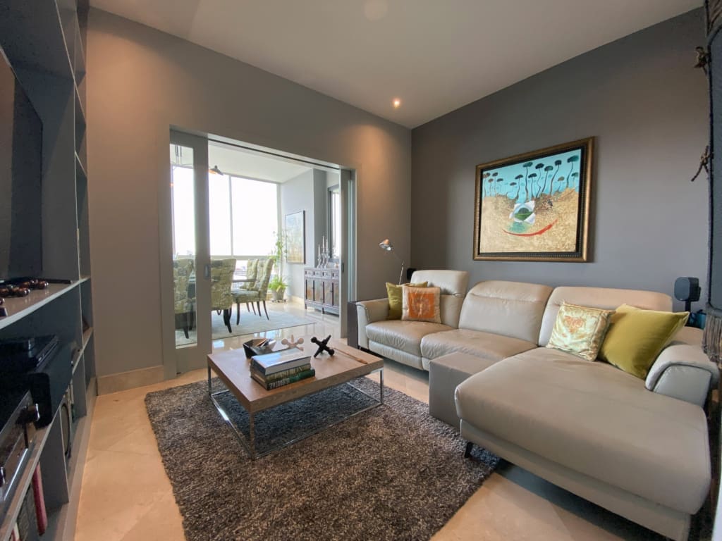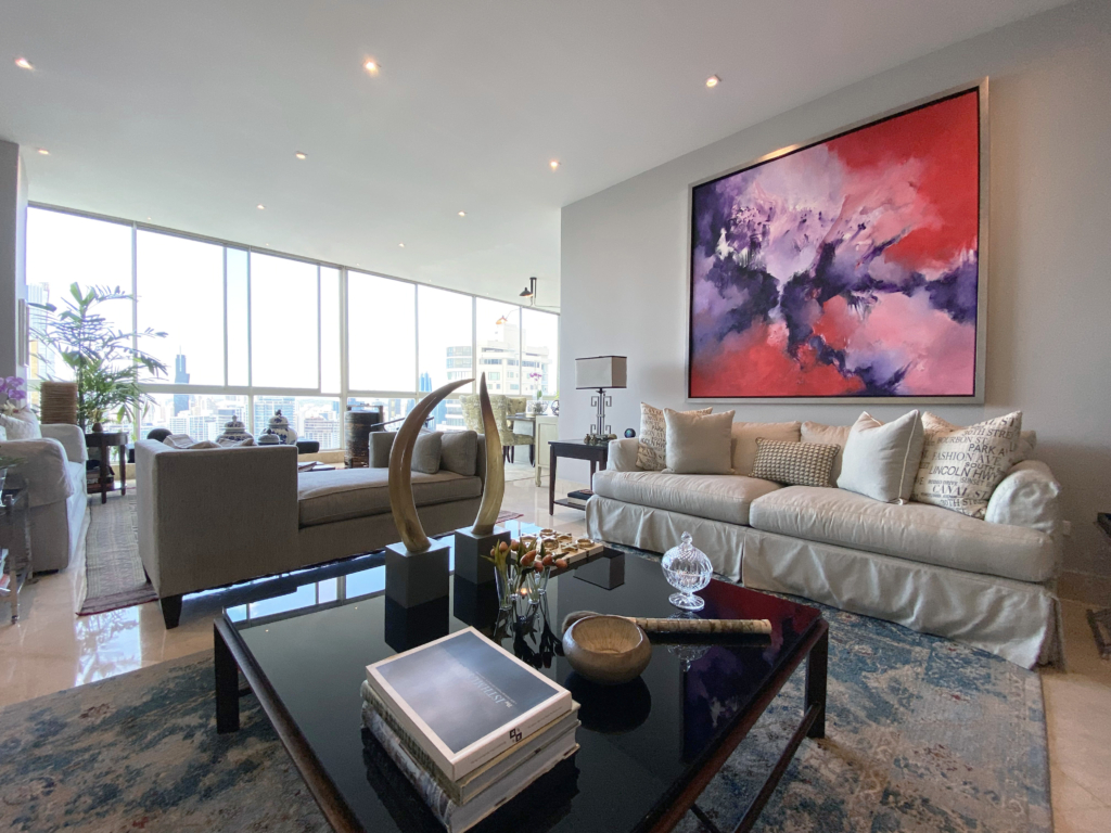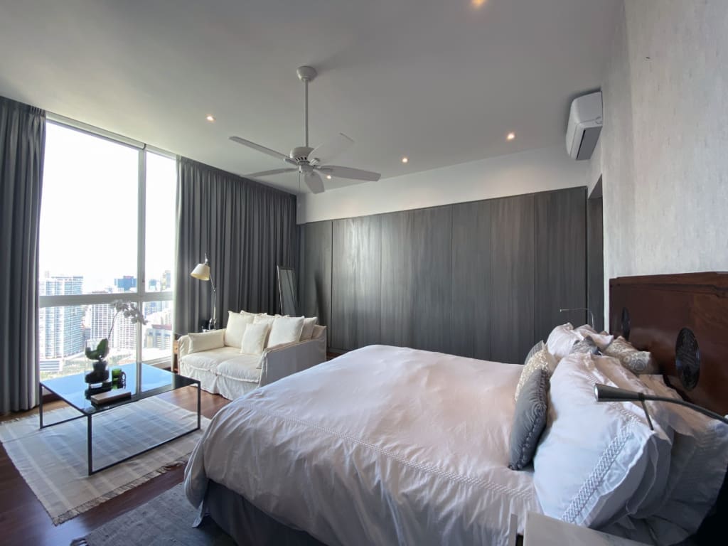 Este bello apartamento de 350 m2 con altura de piso a techo de 3.40 m, posee ventilación cruzada y espectaculares vistas a la Bahía y Ciudad de Panamá. Este apartamento cuenta con 3 habitaciones, la principal posee walk-in clóset, baño privado y una hermosa vista a la Bahía de Panamá, las otras 2 recámaras cuenta con su baño privado. Además podrá encontrar en este apartamento un vestíbulo, amplia sala comedor, sala de entretenimiento audiovisual, sala familiar con 2 pupitres integrados, espaciosa cocina con desayunador y vista al mar, lavandería y cuarto y baño de servicio.