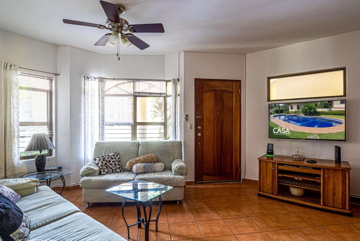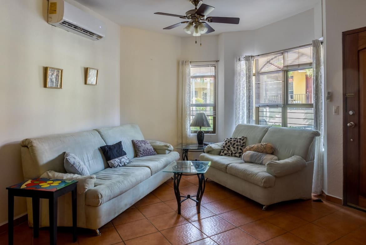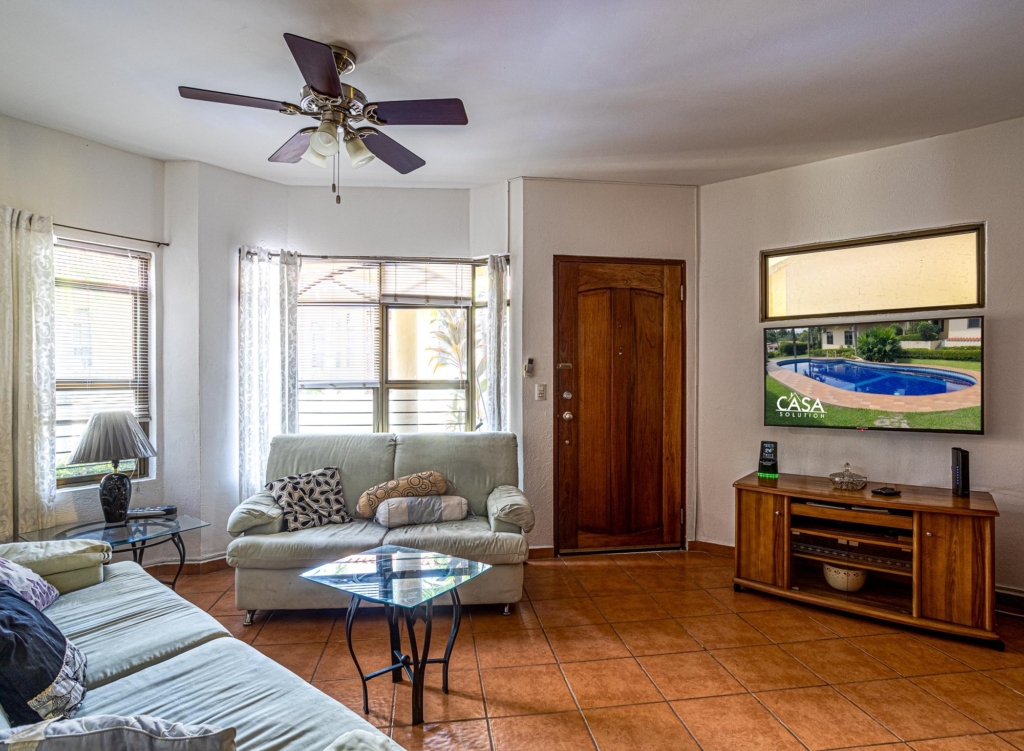Este espacioso condominio en venta en Ph Cuesta del Sol está convenientemente ubicado a solo 1 km del centro de David, Chiriquí. Como una de las unidades más grandes de la comunidad, ofrece una ubicación privilegiada con su puerta de entrada y una pequeña terraza directamente frente a la piscina. El condominio cuenta con una amplia sala de estar, comedor y una sala familiar/espacio de estar adicional adicional. Al ingresar a la propiedad, lo recibe una sala de estar y una cocina. La cocina, equipada con muebles de madera, está separada del salón por una barra americana con fregadero. El comedor está claramente separado de la cocina y la sala de estar por un arco. La unidad incluye dos amplias recámaras, cada una con closets y su propio baño. El baño principal cuenta con una bañera hundida. Además, hay un espacio de oficina exclusivo, perfecto para trabajar desde casa. El condominio viene totalmente equipado con electrodomésticos estándar, lavadora y secadora, televisores grandes, cocina completamente amueblada y ropa de cama completa. En la parte trasera hay una terraza privada con espacio ajardinado, ideal para relajarse. Cuesta del Sol es una comunidad centrada en los jubilados situada cerca del centro de David. Esta comunidad cerrada es conocida por su ambiente amigable, con dos piscinas, jardines y estacionamiento seguro.