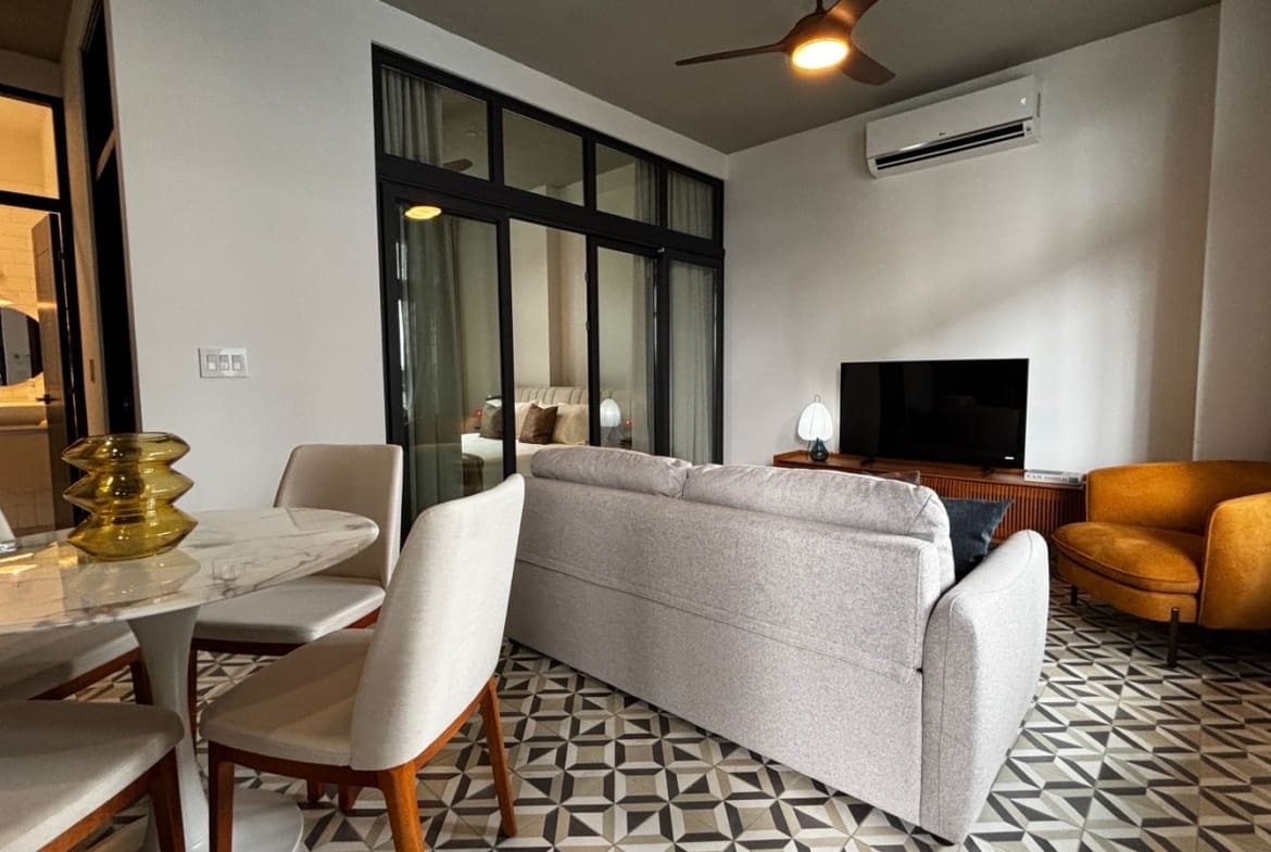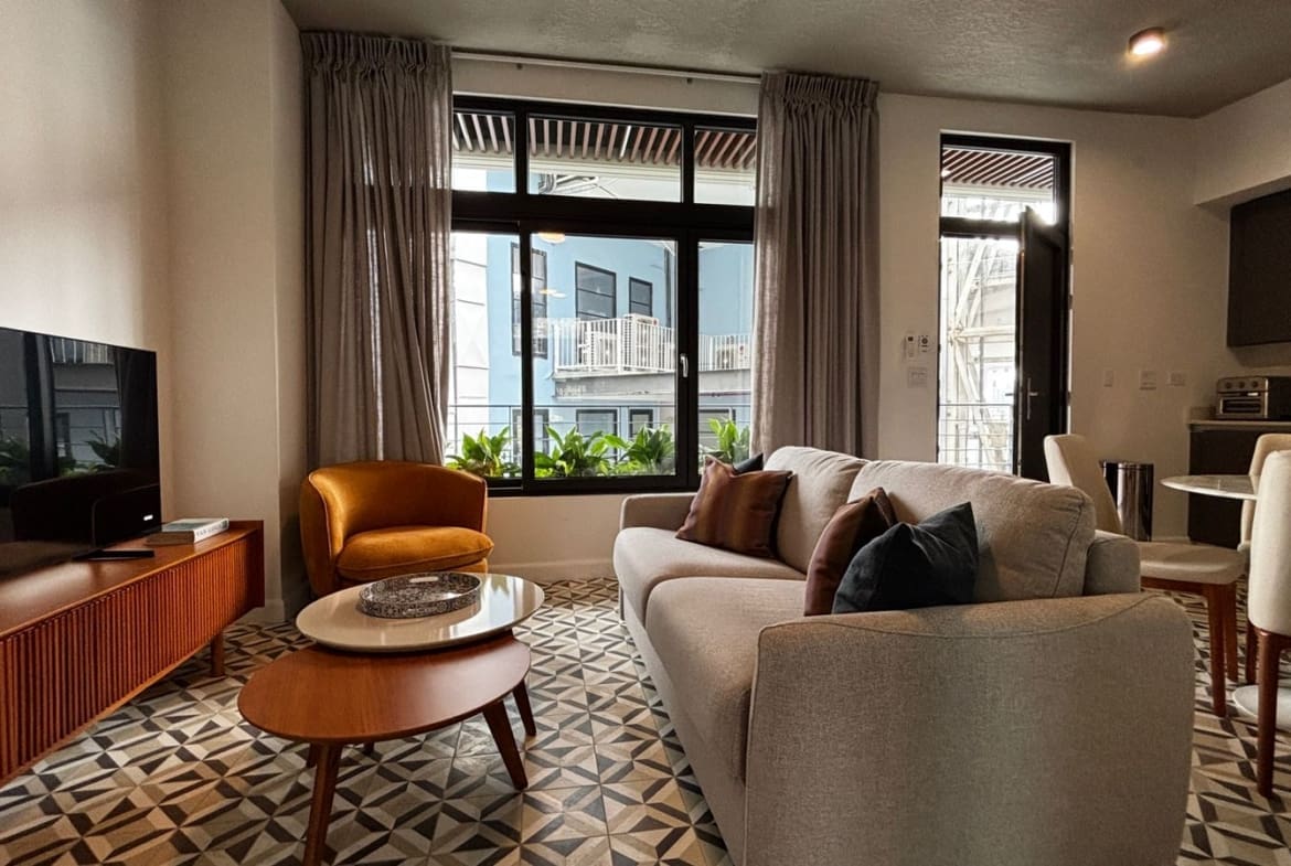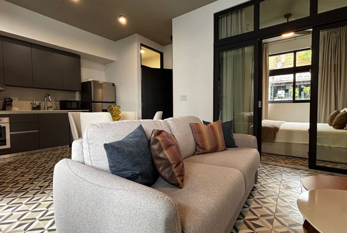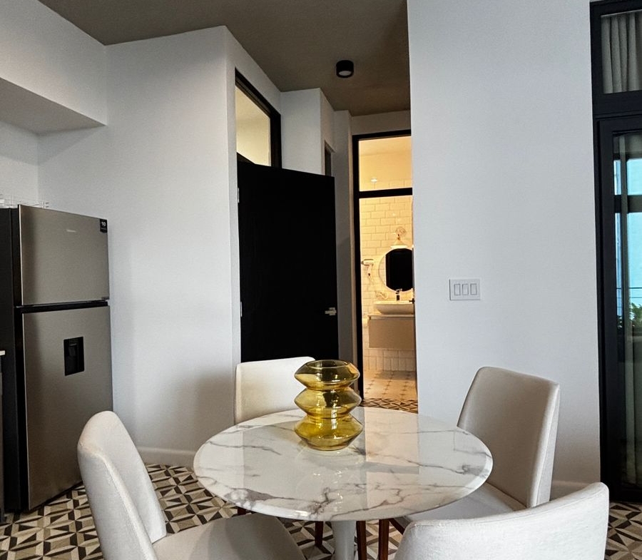 Apartamento de diseño práctico y acogedor con excelente iluminación natural. Ubicado en el corazón del Casco Antiguo, a pasos de restaurantes, plazas, cafés y galerías. Consta de una recámara cómoda, un baño completo, cocina abierta y sala comedor integrados. Equipado con línea blanca, aire acondicionado y mobiliario moderno.