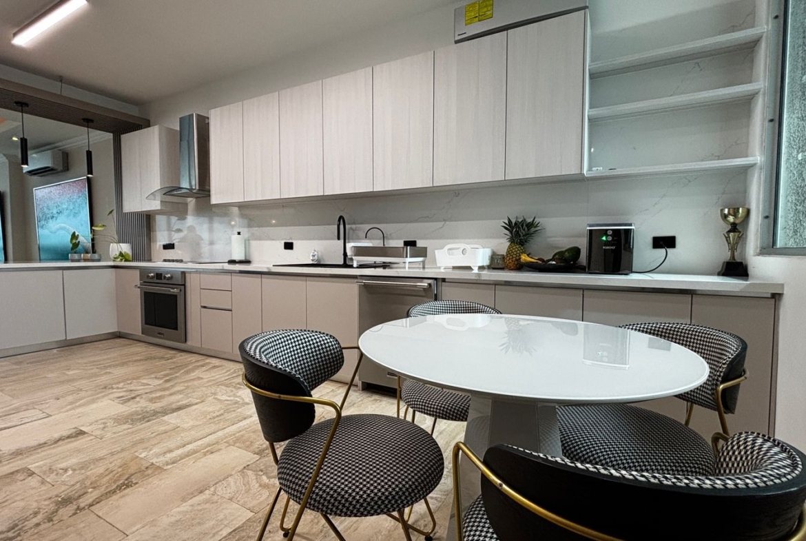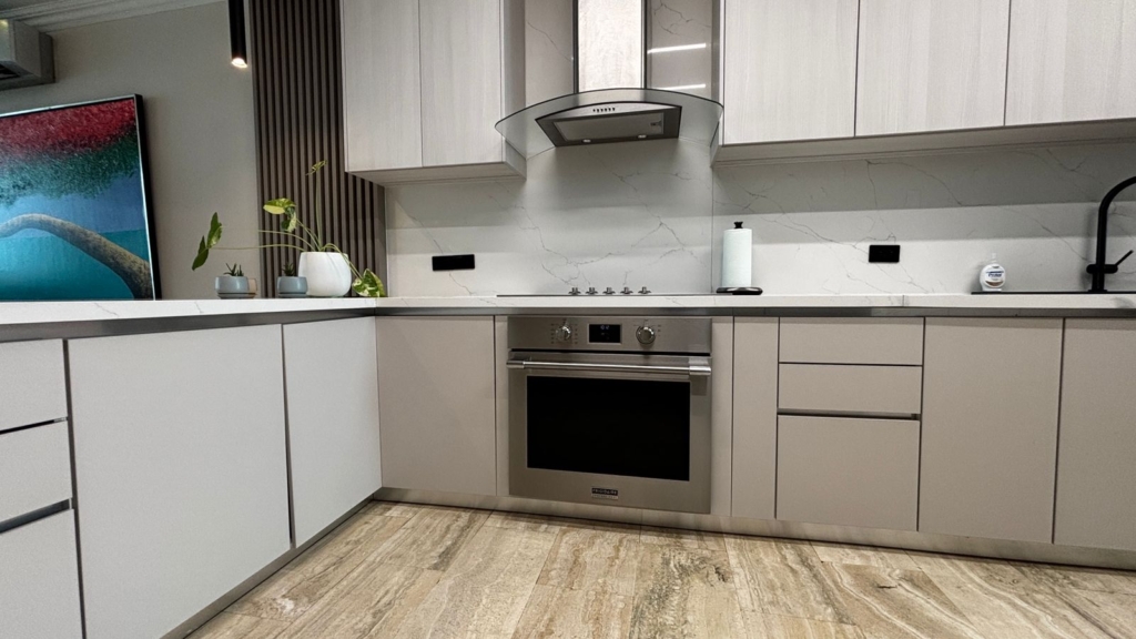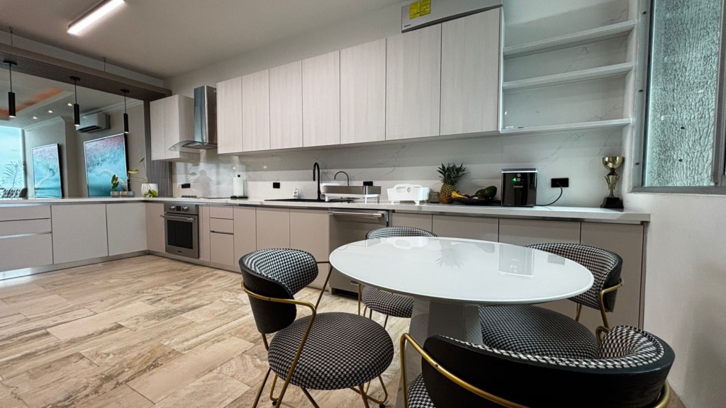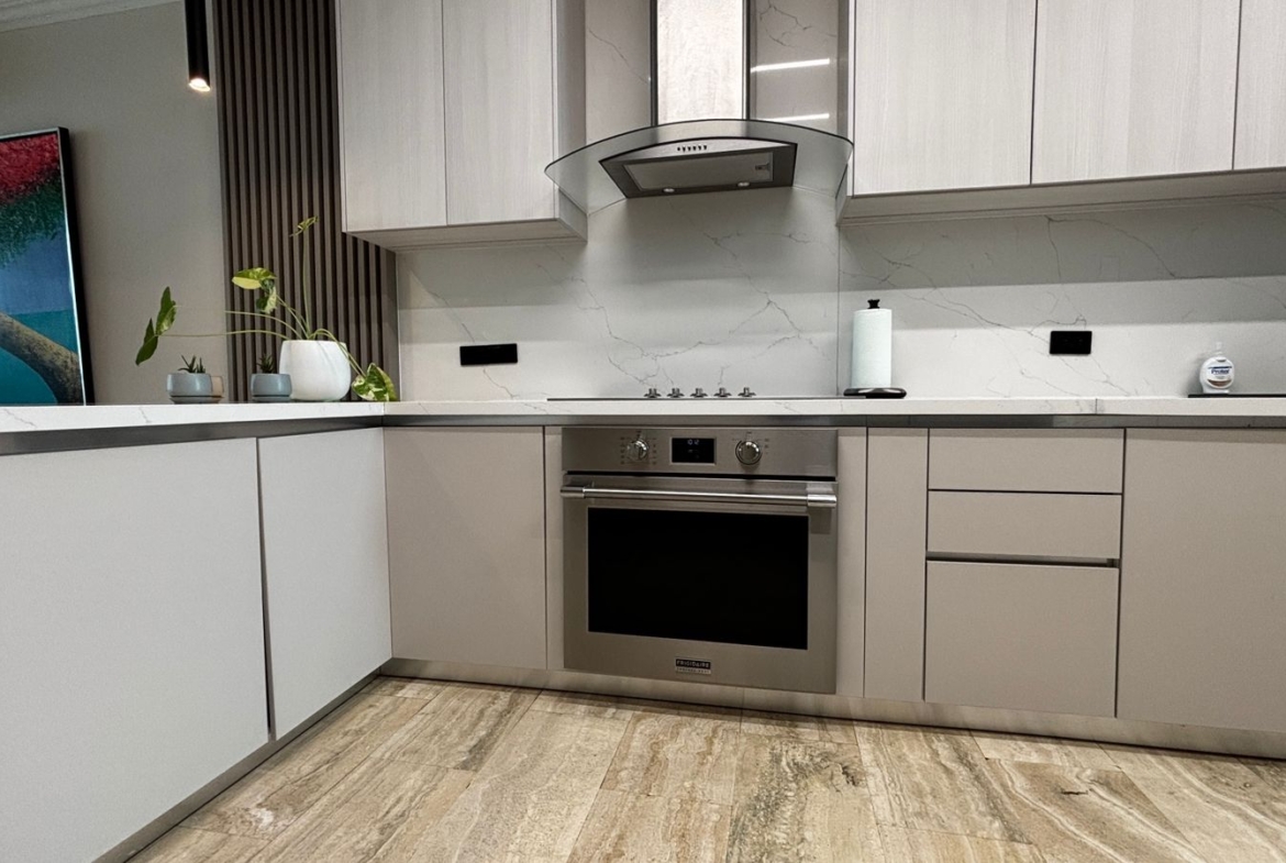 Cocina moderna con sobre de cuarzo y muebles modulares