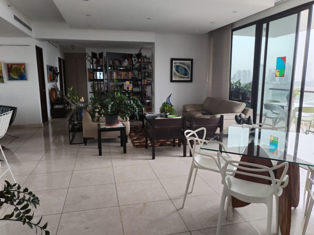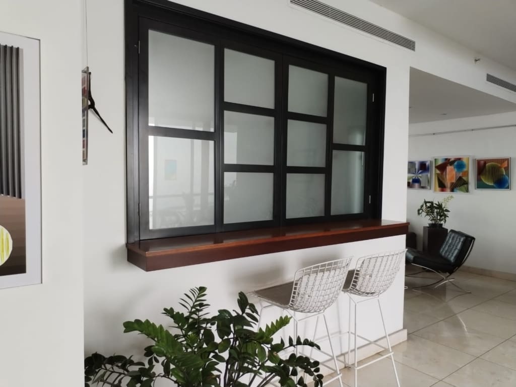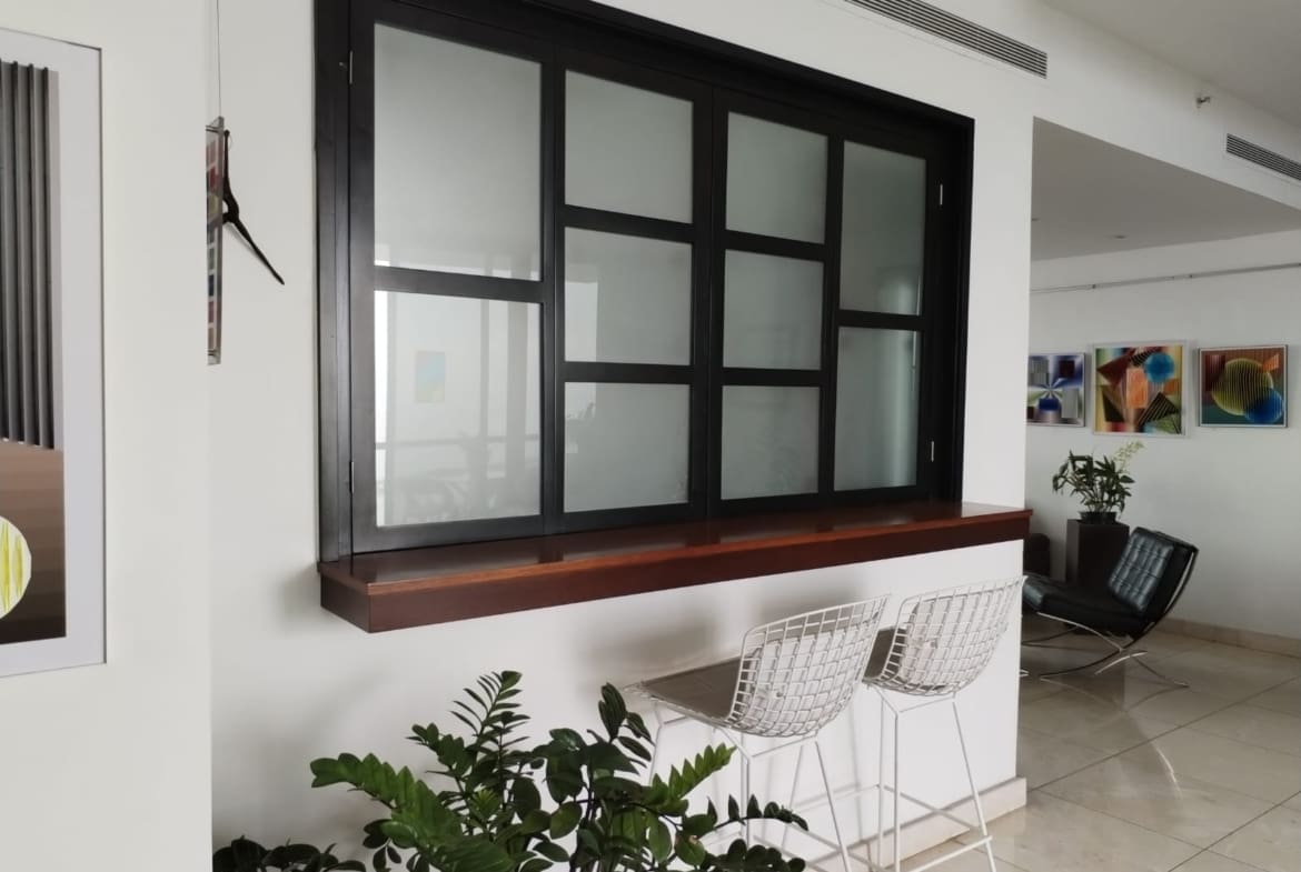 Amplia sala comedor con ventanales de piso a techo y balcón con vista al mar.