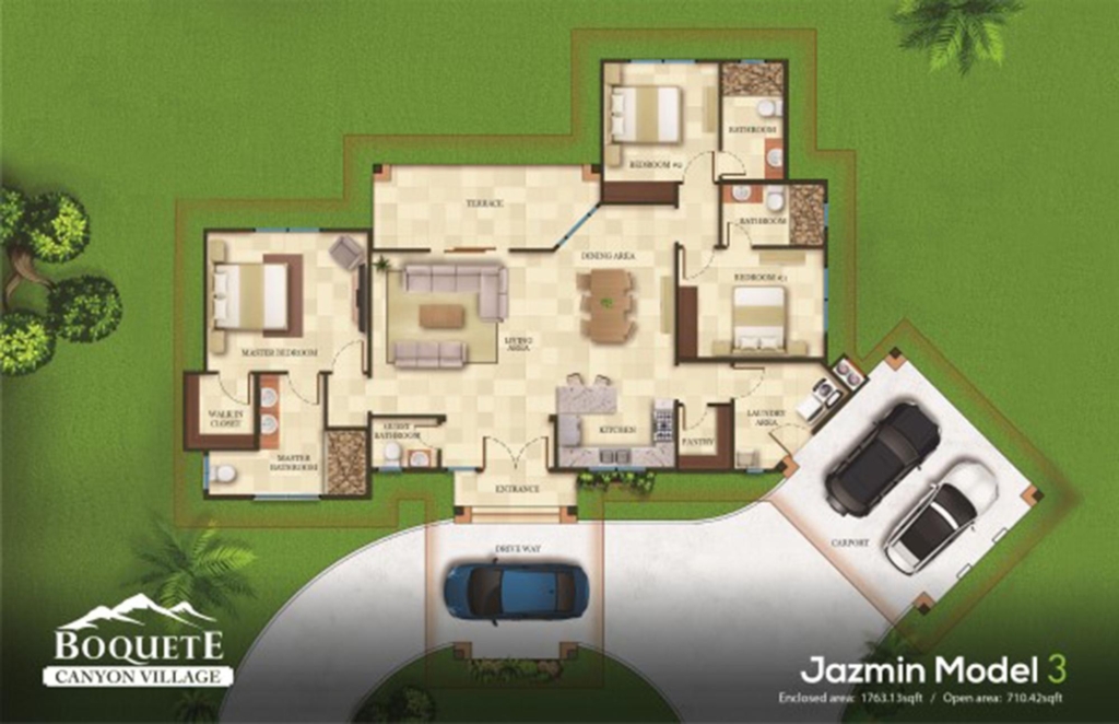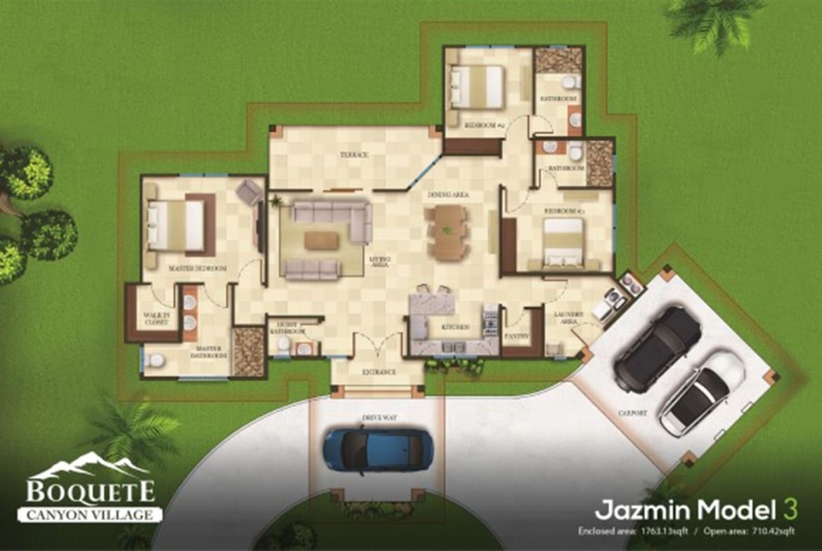 Bienvenido a la casa modelo Jazmin Style 3B en Boquete Canyon Village. Esta residencia en un terreno de 1500m² con una casa de 238m² cuenta con cuatro recámaras, cuatro baños y medio y dependencia de servicio con baño privado. El diseño de concepto abierto combina áreas de sala, comedor y cocina, con una isla central que mejora la estética y la funcionalidad. El dormitorio principal incluye un baño privado con dos lavabos y un amplio vestidor. Dos dormitorios adicionales tienen cada uno baño privado completo. Una habitación adicional con baño adjunto ofrece versatilidad para invitados o un ayudante residente. La terraza cubierta ofrece unas vistas impresionantes, perfectas para relajarse. Boquete Canyon Village ofrece una excelente infraestructura, una casa club, gimnasio, piscina, senderos para caminar y seguridad de primer nivel. Desarrollada por exitosos inversionistas panameños, la comunidad ofrece una combinación de vida moderna y belleza natural. Experimente la comodidad y la elegancia en la casa modelo Jazmin Style 3B. Haz de Boquete Canyon Village tu nuevo hogar.