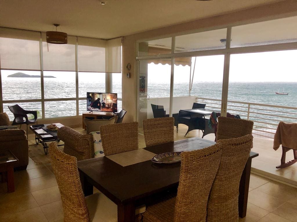 Lindo y simpático apartamento ubicado al borde de la playa, bañado de luz con una hermosa vista al mar. Excelente reparto que incluye 3 recámaras, 2 baños, cuarto y baño de servicio, cocina, sala/comedor y balcón. Dueño de un depósito y 1 estacionamiento bajo techo. El complejo posee planta eléctrica parcial, tanque de reserva de agua, piscina, jacuzzi con calefacción y acceso directo a la playa.
