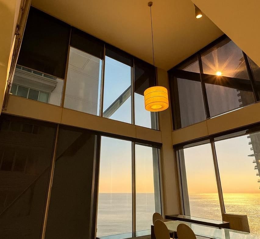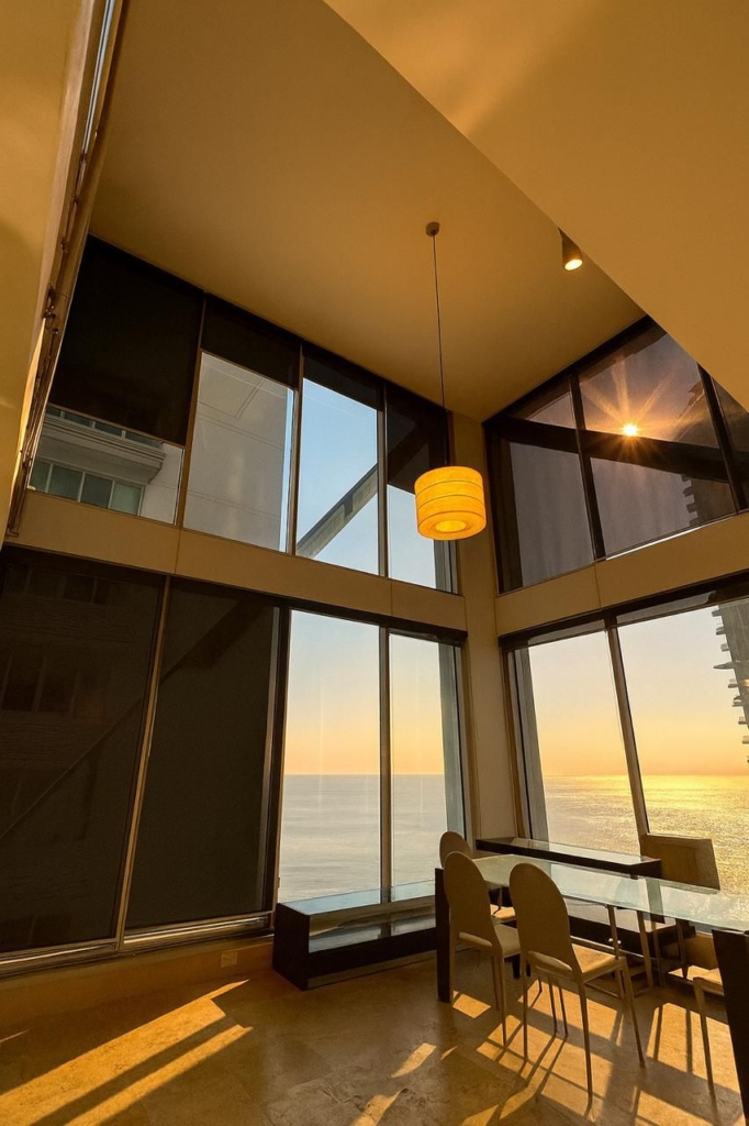 Moderna sala y comedor con ventanales de piso a techo