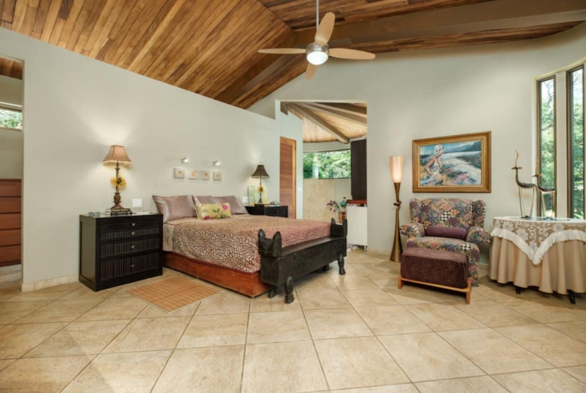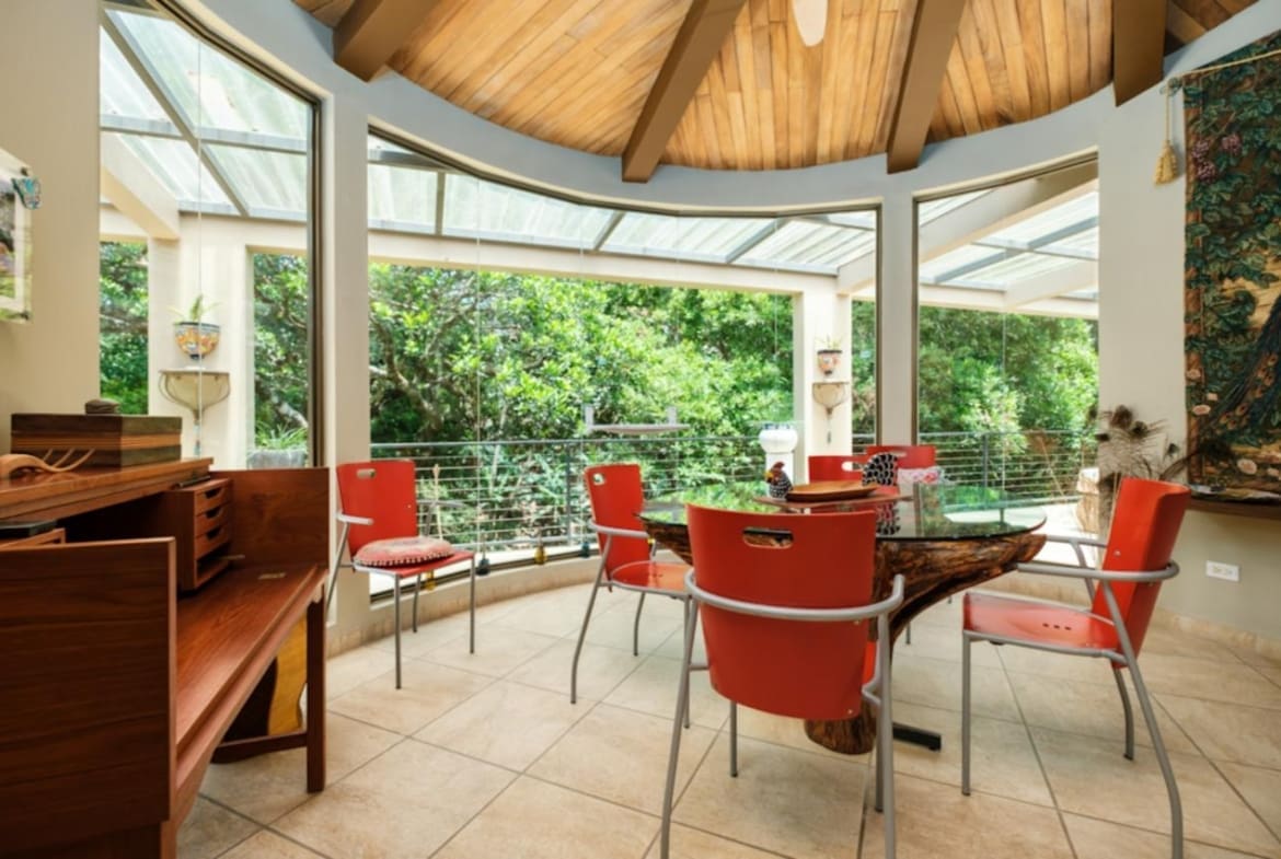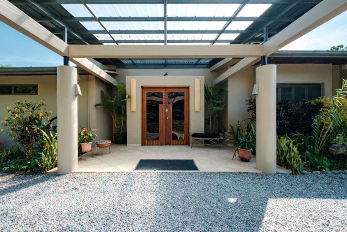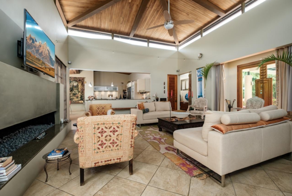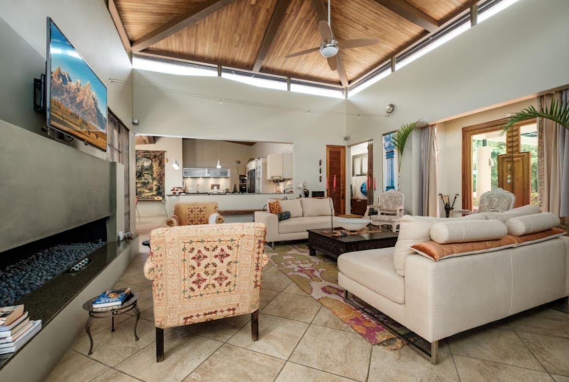 ¡Bienvenido a tu santuario de lujo y tranquilidad! Esta maravilla arquitectónica cuenta con puertas personalizadas con entrada sin llave, una chimenea hecha a medida y techos altos adornados con madera de Guanacaste. La cocina gourmet cuenta con azulejos de cerámica española, encimeras de granito y electrodomésticos de primera línea, perfectos para el entretenimiento. Retírese a suntuosas habitaciones con terrazas privadas y baños de California. En el exterior, descubra exuberantes terrenos con 38 variedades de palmeras, senderos serpenteantes y encantadores puentes. Disfrute de riego con arroyo vivo durante todo el año y de un sistema de filtración de agua trifásico. Las actualizaciones recientes incluyen pintura exterior y una revisión del techo en 2023. ¡No pierda esta oportunidad de disfrutar de serenidad y sofisticación!