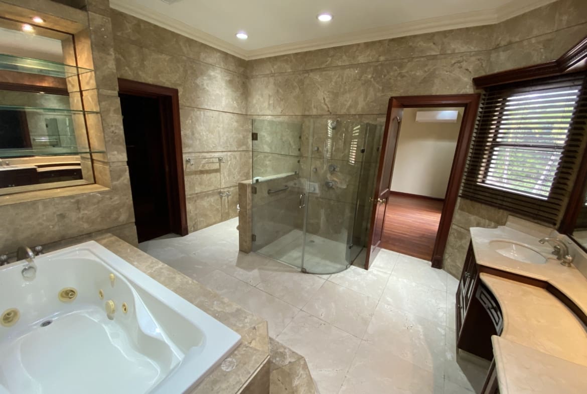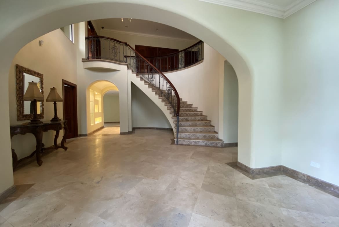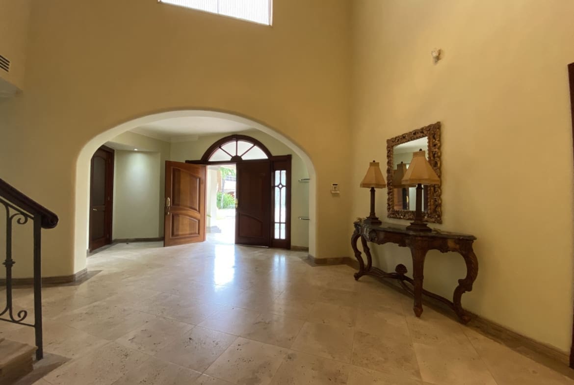 Desde afuera se puede apreciar la impotencia de su fachada, con paredes blancas y techos de teja roja, con una inmensa porta-cochera, una vez entras a la propiedad, te sorprende un amplio lobby de doble altura y una escalera de mármol en forma de espiral, entre lo mas destacado de esta casa, conseguimos su jardín y patio, con una amplia piscina de un azul eléctrico intenso que hace juego con la vegetación y el congrani que reviste gran parte del piso del patio, su gazebo invita a compartir en familia o con amigos de los mejores momentos que estas por disfrutar en esta propiedad que puede ser tuya.