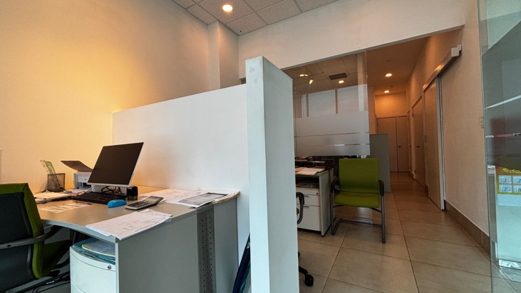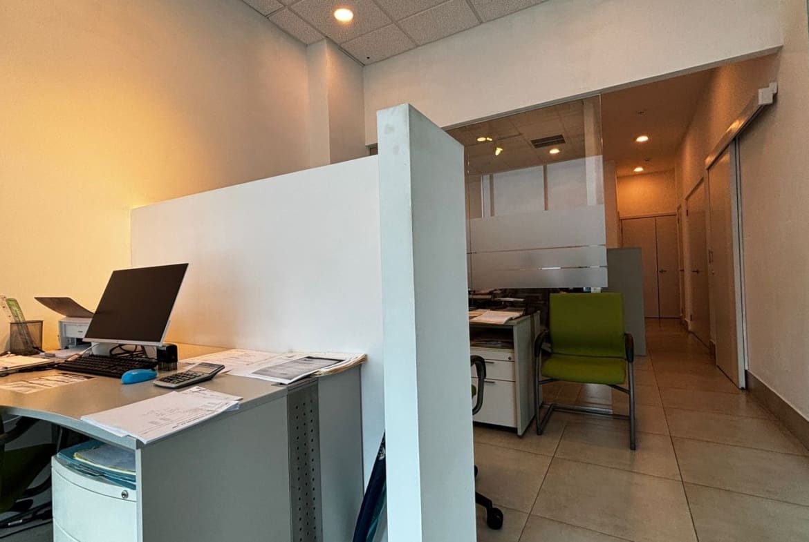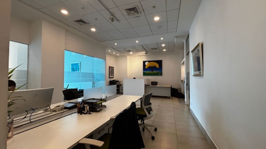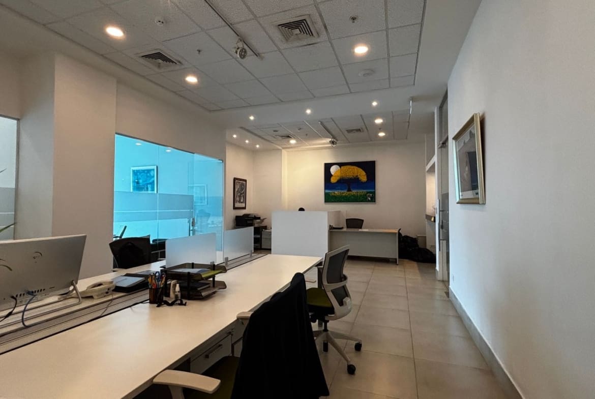 La oficina cuenta con cuatro oficinas cerradas, área de coworking, zona de cafetería, baño interno y sistema de aire acondicionado central.