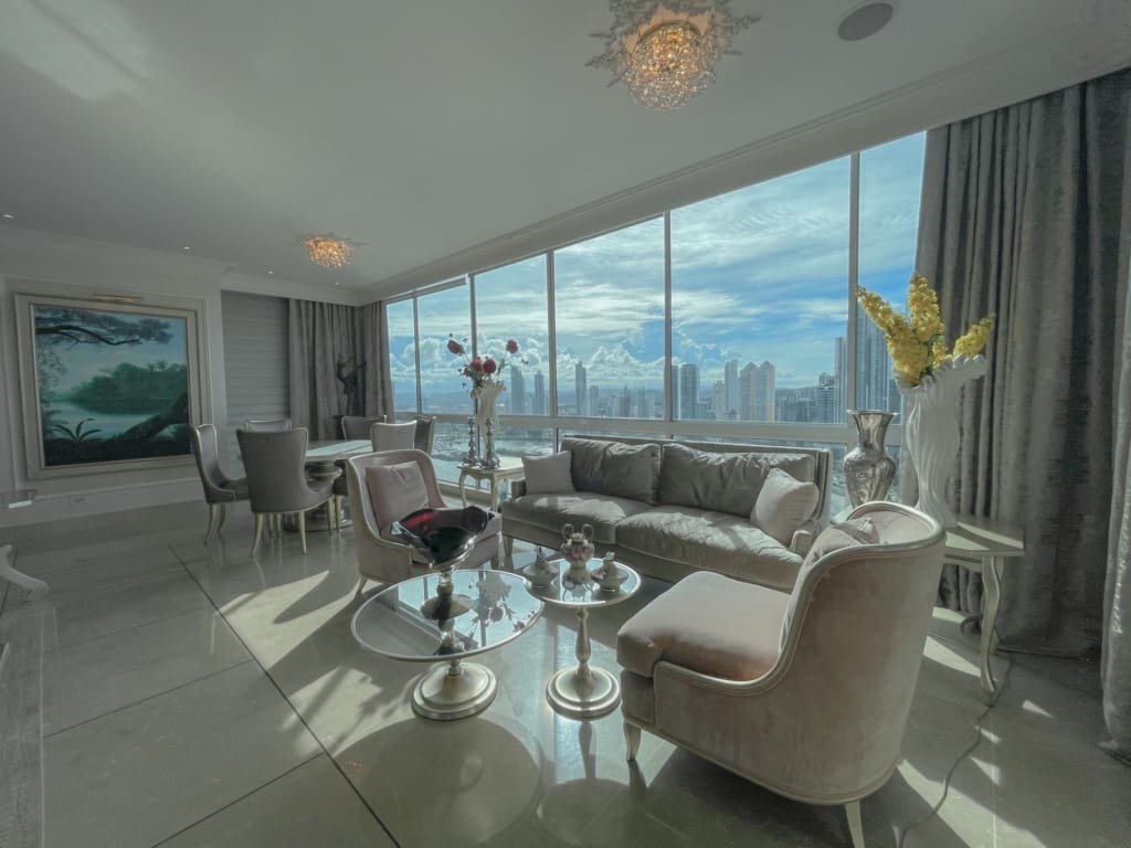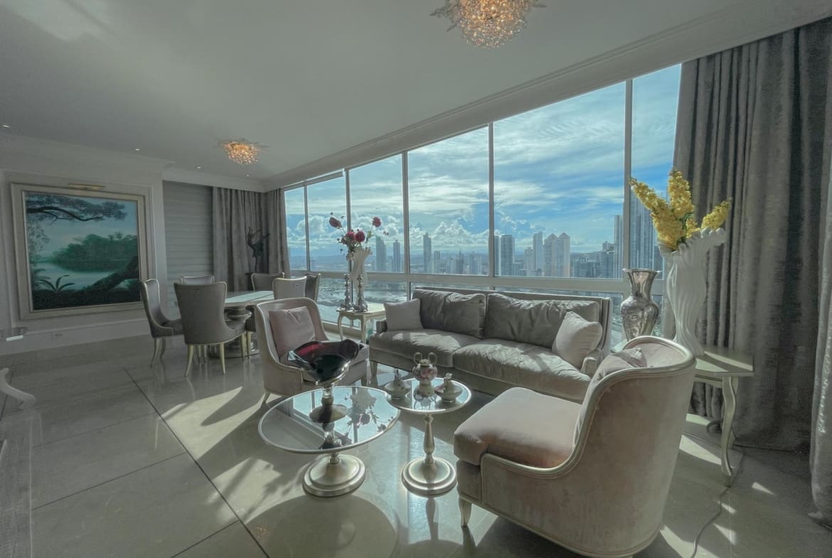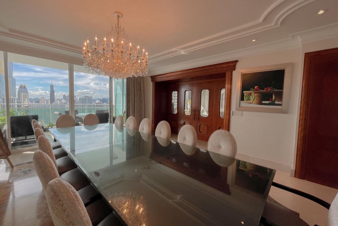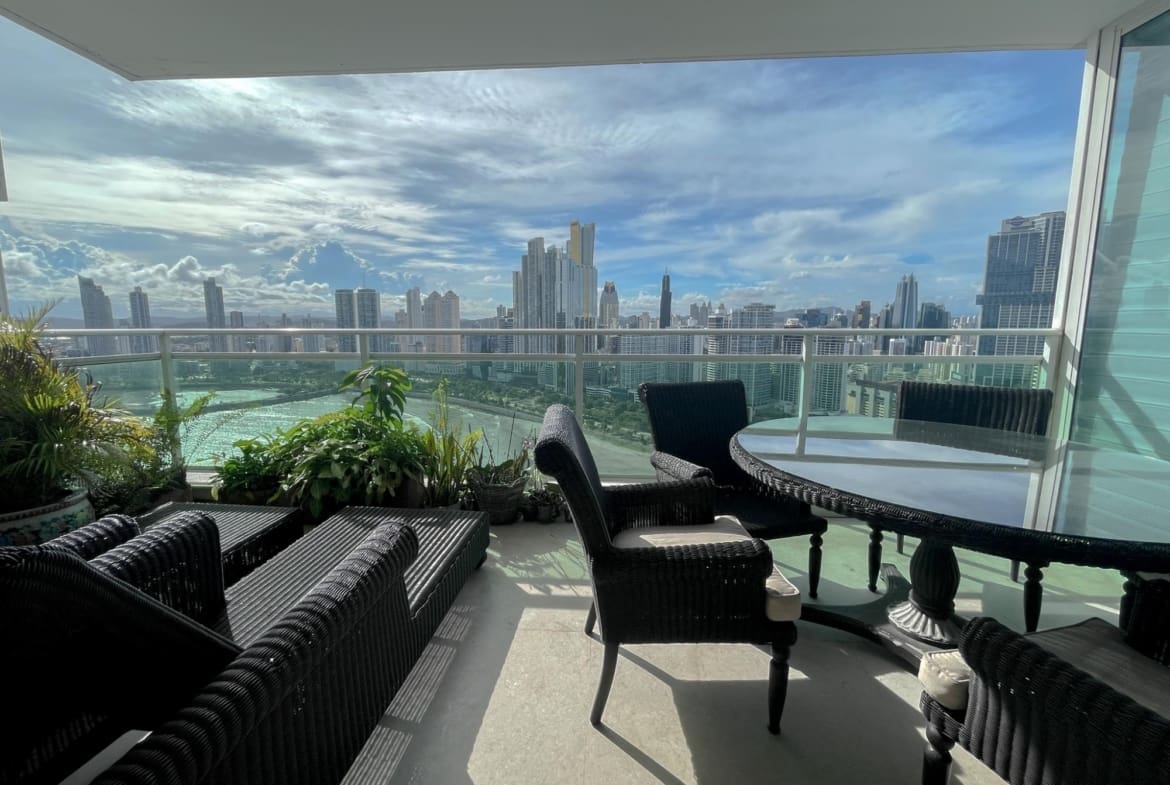 Punta Roca – Punta Paitilla – Se vende Lujoso apartamento de 526m2 distribuidos en amplia sala con iluminación natural y finos acabados, comedor, estudio, sala familiar, medio baño de visita, balcón con vista al mar, cocina con desayunador, 4 recámaras completas, lavandería, cuarto y bano servicio, 4 estacionamientos, 1 deposito. El edificio cuenta con area social completa con piscina de adultos y niños, gimnasio, cancha de squash y basketball, jacuzzi, área de juegos para niños, sala de eventos y mas. Lujoso lobby, 2 elevadores principales 1 elevador de servicio, estacionamientos de visita, seguridad 24/7.
