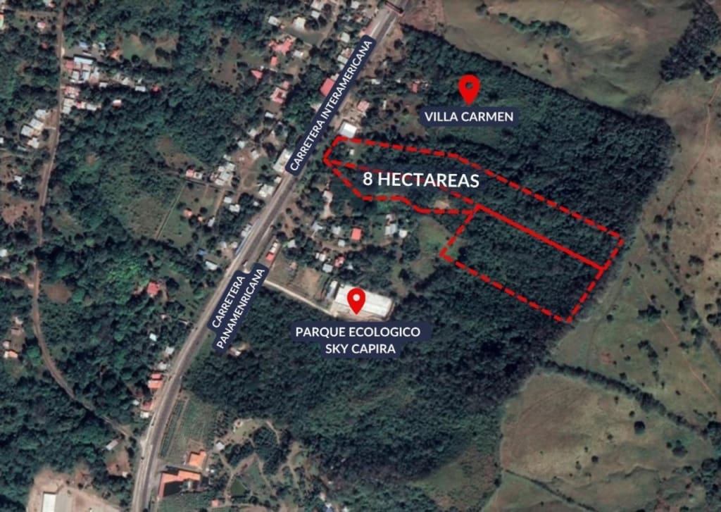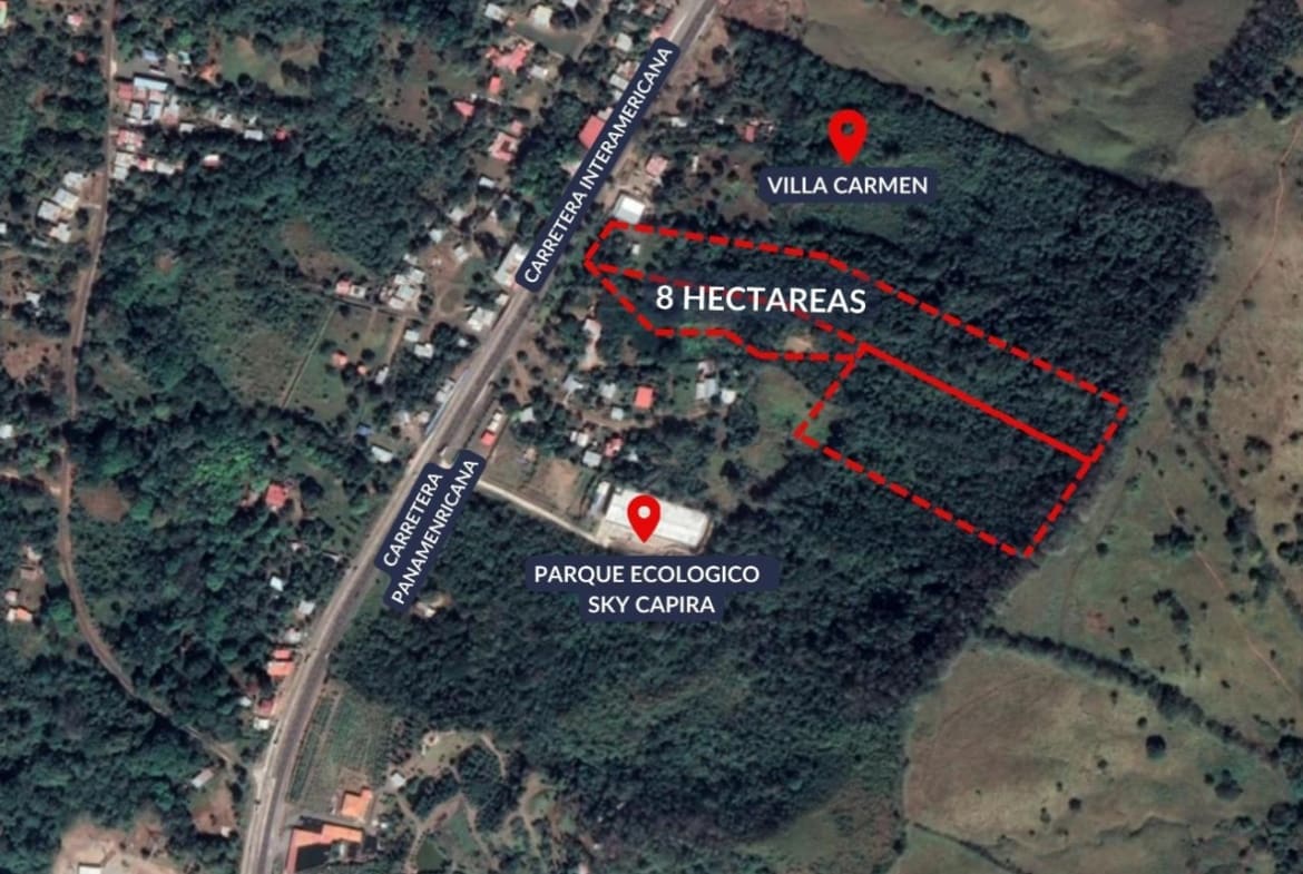 Se vende terreno de 8 hectáreas (83,480.76 metros cuadrados) con 70 metros de frente compuesta de 3 fincas para desarrollo en Corregimiento de Villa del Carmen, Distrito de Capira, Provincia de Panamá. Específicamente se encuentra ubicado sobre la Carretera interamericana. El acceso a la propiedad se hace directamente desde la Carretera interamericana. La finca No.1 cuenta con una superficie registrada de 3 hectáreas con 8,508.73 M2. La finca No.2 cuenta con una superficie registrada de 9,688.46 M2. La finca No.3 cuenta con una superficie registrada de 3 hectáreas con 5,283.57 M2. A solo 1 hora de la ciudad de Panama.