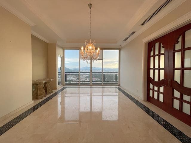 Torre Imperial ubicado en La Cresta cuenta con 27 exclusivos apartamentos en una zona tranquila donde usted y su familiar podrán gozar de privacidad y tranquilidad. Esta residencia de 677 m2 cuenta con amplios espacios distribuidos en 4 recámaras, 4.5 baños, espectacular sala con piso de mármol, comedor, den familiar, cocina con desayunador, amplia terraza que rodea el apartamento con vista panorámica al mar y la ciudad, 2 cuartos servicio con baños, línea blanca, aire acondicionado central, depósito y 4 estacionamientos. Además el edificio cuenta con lujoso lobby de doble altura, área social completa con piscina, gimnasio, área de juegos para niños, gran salón de eventos y seguridad las 24 horas