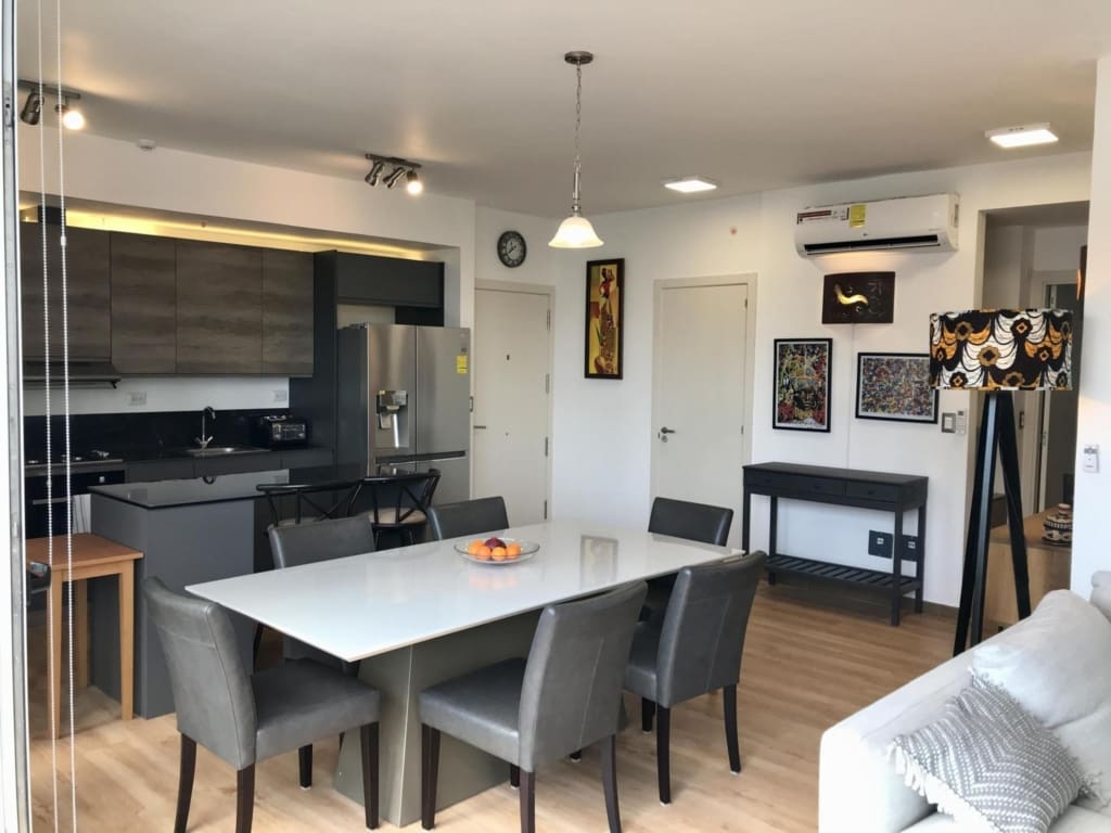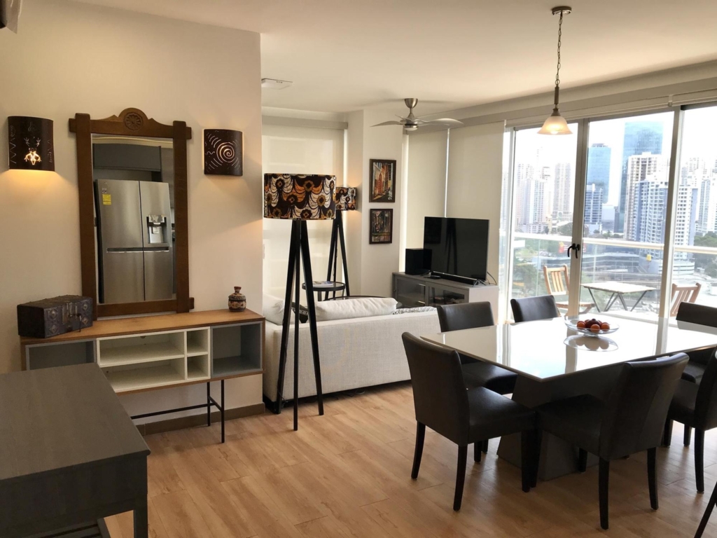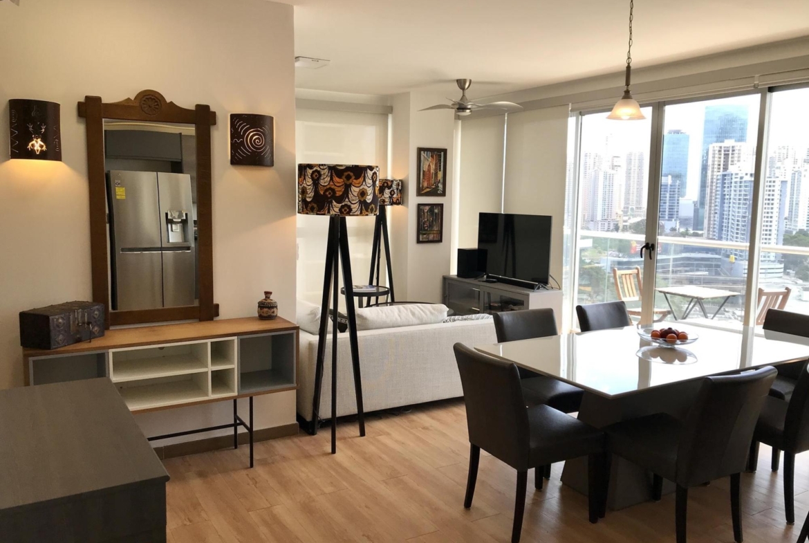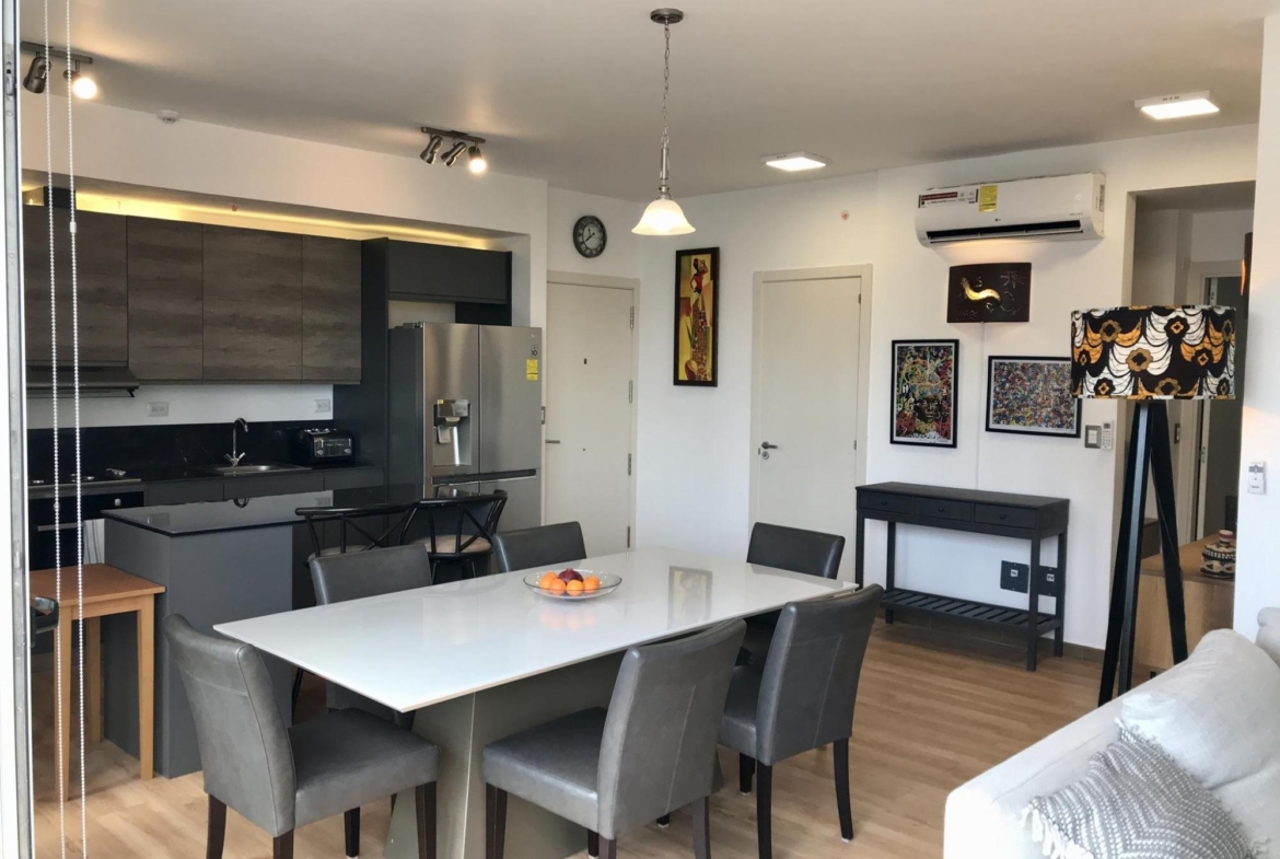 Este apartamento amoblado de dos recámaras en la nueva torre PH Boutique Quartier Marbella tiene acabados modernos y una vista panorámica del horizonte de la ciudad de Panamá. Sus residentes disfrutan del acceso a las fantásticas áreas sociales en la azotea del edificio, que incluyen una piscina tipo infinity, gimnasio, terraza y café/bar. Es uno de los pocos edificios en la Ciudad de Panamá que cuenta con la licencia otorgada por la ATP que permite alquileres a corto plazo tipo Airbnb Las características adicionales de este apartamento incluyen: – 86 m2 de construcción – Areas de sala, comedor y cocina de concepto abierto, todas con pisos laminados de madera y ventanas del piso al techo – Balcón que recorre todo el largo de la sala-comedor – Cocina full equipada con electrodomésticos de acero inoxidable – Lavandería con lavadora y secadora – Recámara principal con baño privado – Segunda recámara (actualmente habilitada como oficina con sofacama – Baño externo completo – Unidades de aire acondicionado tipo split Inverter de bajo consumo en todo el apartamento – Dos estacionamientos asignados (doble fondo) PH Boutique Quartier Marbella es un edificio bien mantenido con excelente seguridad. Ubicado en una calle lateral tranquila en Marbella, es un paseo fácil de dos cuadras al distrito bancario de la ciudad, la Avenida Balboa y el área recreativa frente al mar Cinta Costera. Hay que coordinar visitas con 24 horas de aviso.