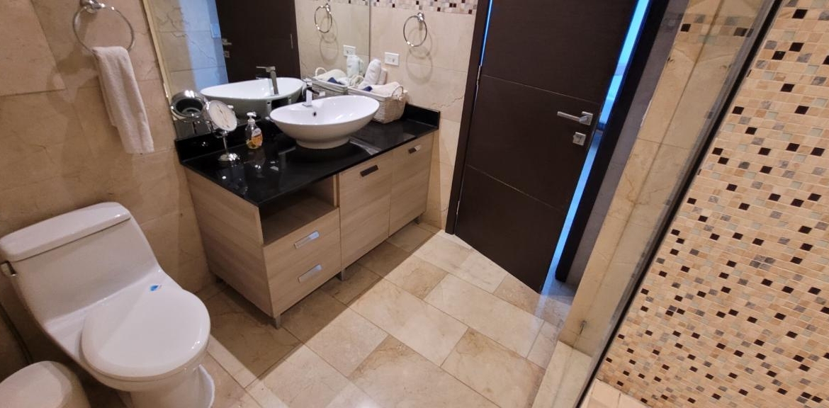 Se vende hermoso apto de 129mt con 1 recamara 1.5 baños sala comedor cocina lavandería balcón en are a de sala y recamara 1 estacionamiento viene con muebles, linea blanca cortinas, aires centrales. el edificio cuenta con área social con: Piscina, salón de juegos, lounge, salón fiestas, squash, racquet ball, gym, sala de juegos niños guardería jardín. bussiness center. área comercial con cafeterías, lavandería y supermercados, farmacias. Rápido acceso al corredor sur.